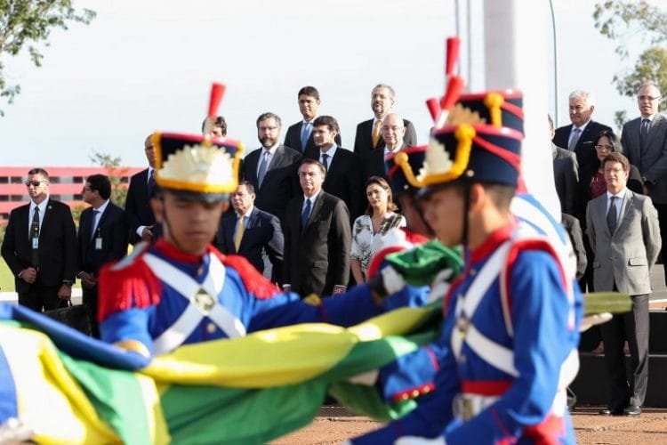 O presidente da República, Jair Messias Bolsonaro, participou na manhã desta terça-feira (23) do hasteamento da Bandeira na área externa do Palácio da Alvorada. A cerimônia também foi presenciada por ministros, pelo vice-presidente, general Hamilton Mourão, e pela primeira-dama, Michelle Bolsonaro, entre outras autoridades.