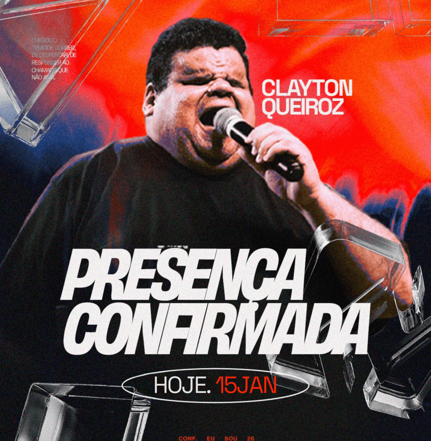 A participação de Clayton Queiroz faz parte da conferência Eu Sou, que teve início no dia 11 e segue até o dia 18 de janeiro. Ao todo, estão programadas dez sessões, com a proposta de marcar trajetórias, despertar propósitos e ativar aquilo que, segundo a organização, Deus já anunciou sobre a vida dos participantes.