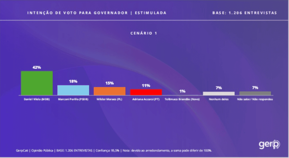 Nos cenários estimulados, quando os nomes dos possíveis candidatos são apresentados, a liderança de Daniel Vilela se amplia de forma consistente. No primeiro cenário, ele registra 42% das intenções de voto, seguido por Marconi Perillo com 18% e Wilder Moraes com 15% . Já em um segundo cenário, Vilela cresce para 43%, mantendo vantagem confortável sobre os demais concorrentes. No terceiro cenário, o desempenho chega a 45%, consolidando uma trajetória de crescimento progressivo conforme o desenho eleitoral varia .