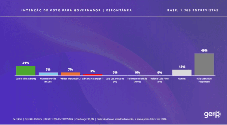 A mais recente pesquisa eleitoral realizada em Goiás pelo Gerp, divulgada nesta terça-feira (14), indica um cenário de ampla vantagem para Daniel Vilela (MDB) na disputa pelo governo do estado. No levantamento espontâneo, quando os eleitores respondem sem a apresentação de nomes, o emedebista já aparece na liderança com 21%, enquanto a maioria ainda se declara indecisa, somando 49% dos entrevistados. O dado revela não apenas a presença consolidada de Vilela na memória do eleitorado, mas também um campo ainda aberto para crescimento, com um alto índice de eleitores em fase de definição.