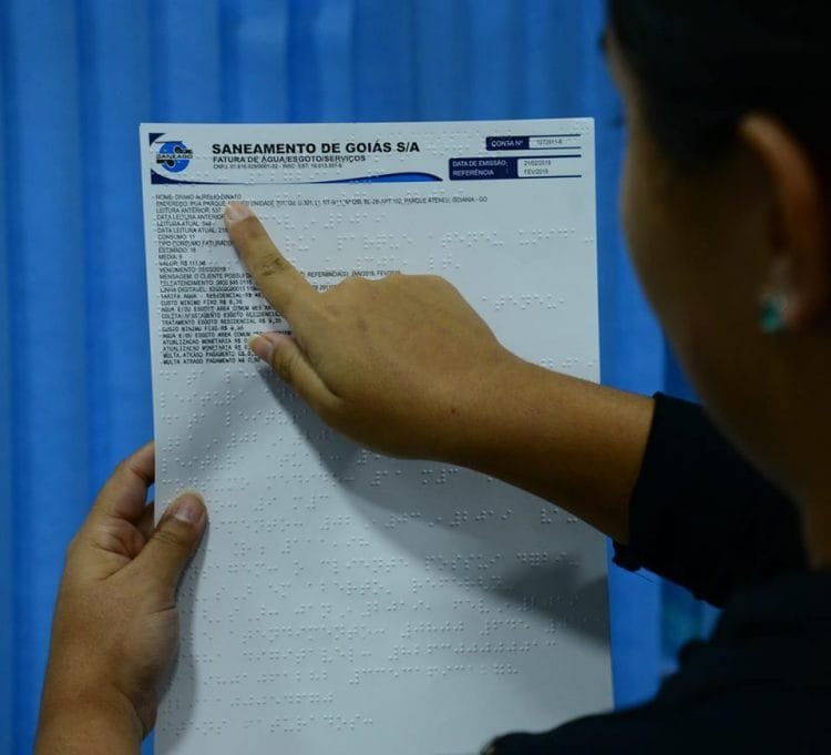 A Saneago é pioneira em Goiás no serviço de emissão de faturas em Braile. O serviço visa facilitar a vida dos clientes que possuem deficiência visual. O benefício está disponível para o deficiente visual que seja proprietário do imóvel ou esteja portando procuração do dono, com contrato vigente de aluguel. Para solicitar o serviço, basta procurar uma unidade de atendimento no Vapt Vupt, e apresentar de documento pessoal, além de comprovação de necessidade especial, como laudo médico, carteira do Setransp ou da Associação dos Deficientes Visuais de Goiás.