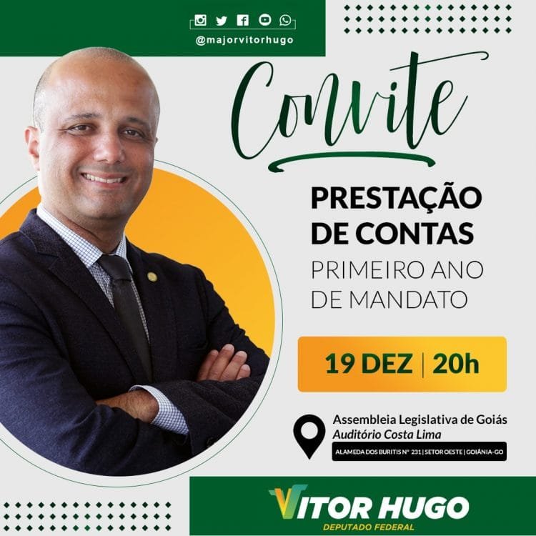O deputado federal Vitor Hugo, líder do governo Bolsonaro na Câmara dos Deputados, fará nesta quinta-feira (19/12) a prestação de contas acerca do primeiro ano de seu mandato como representante dos goianos no Parlamento. “Este é o momento de informar a população e dar respostas às demandas apresentadas durante esse período”, esclarece.