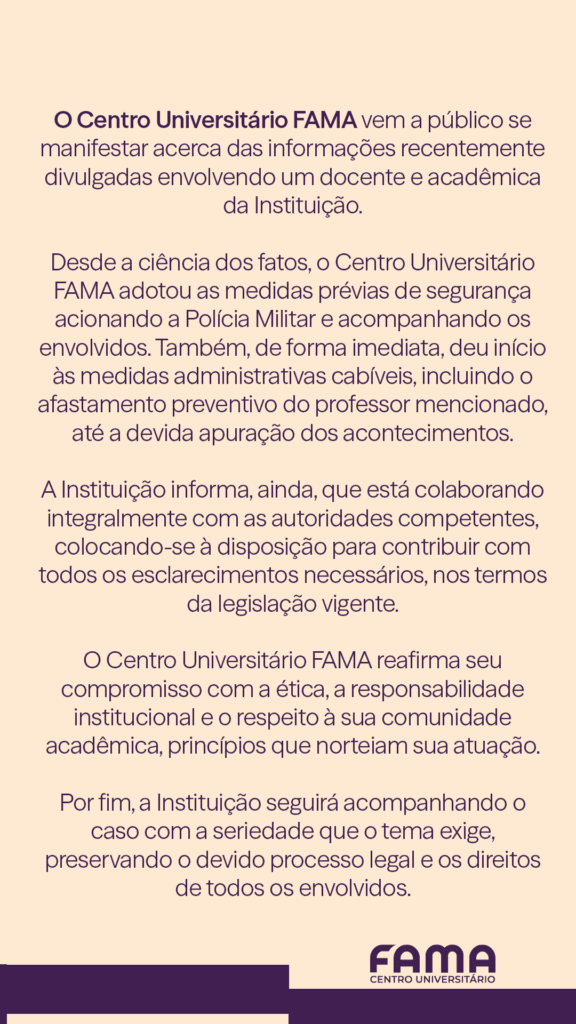 O Centro Universitário FAMA veio a público para se manifestar oficialmente sobre informações recentes envolvendo um docente e uma acadêmica da instituição. Em nota, a universidade destacou que, desde que tomou ciência dos fatos, adotou medidas imediatas voltadas à segurança e à condução responsável do caso.