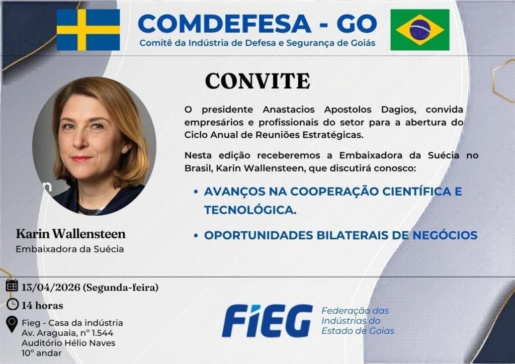 Evento promovido pelo Comitê da Indústria de Defesa e Segurança de Goiás reunirá empresários e especialistas para discutir cooperação científica, tecnológica e oportunidades de negócios entre Brasil e Suécia.