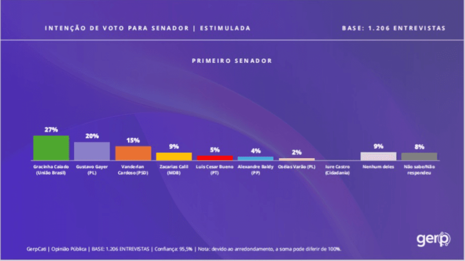 No cenário de primeiro voto para senador, Gracinha Caiado lidera com 27% das intenções, seguida por Gustavo Gayer, que registra 20%. Na sequência aparecem Vanderlan Cardoso com 15% e Zacarias Calil com 9%. Os demais nomes pontuam abaixo desse patamar, como Luis Cesar Bueno com 5% e Alexandre Baldy com 4%, enquanto Oséias Varão soma 2%. Ainda há um contingente de eleitores que declara não escolher nenhum dos nomes ou não sabe em quem votar, indicando espaço para movimentações ao longo da pré-campanha .