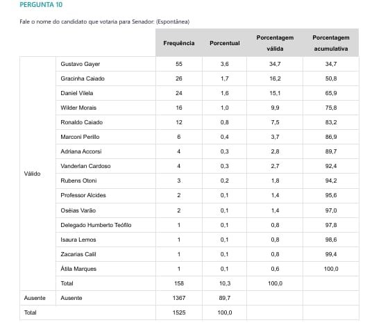 A pesquisa foi realizada por iniciativa própria do Instituto Veritá, entre os dias 9 e 13 de abril de 2026, ouvindo 1.525 eleitores em todo o estado de Goiás. A margem de erro é de 2,5 pontos percentuais, com nível de confiança de 95%. O estudo está registrado no Tribunal Regional Eleitoral sob o número GO-06754/2026 e retrata o cenário atual da disputa pelo Senado a partir da percepção espontânea do eleitor goiano.