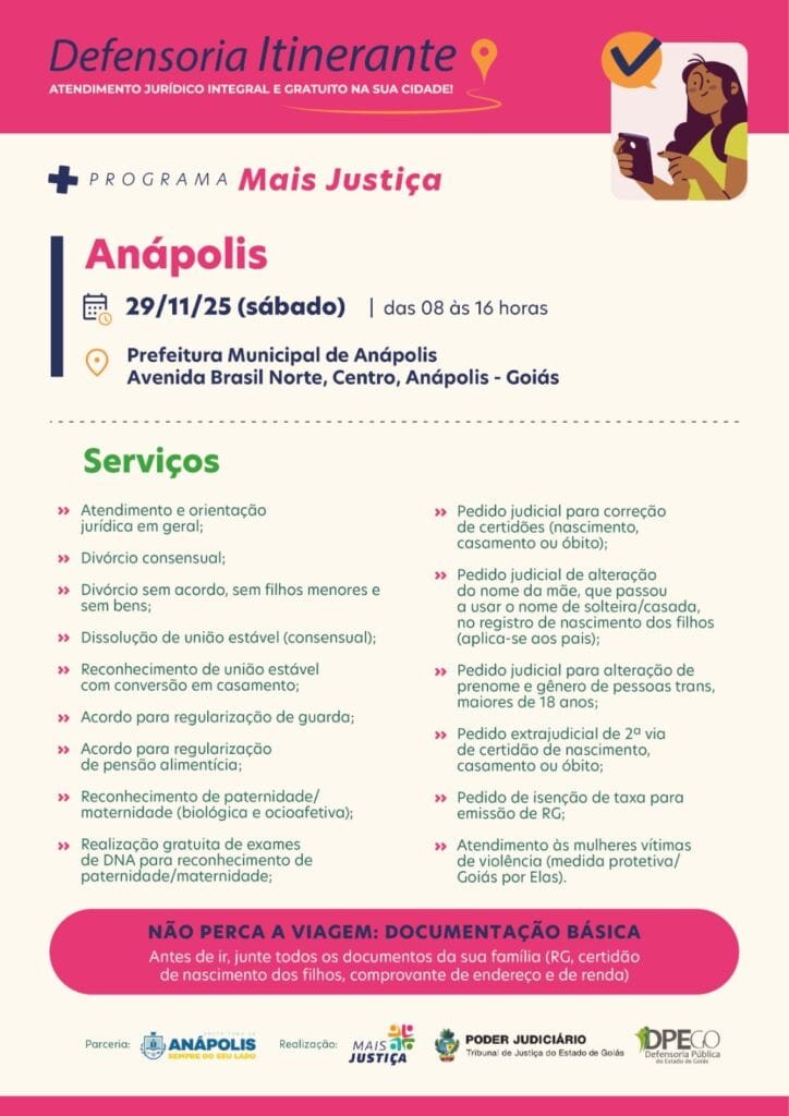A população de Anápolis terá acesso a uma série de serviços jurídicos gratuitos no próximo sábado, 29 de novembro, durante o mutirão Mais Justiça, promovido pelo Tribunal de Justiça de Goiás (TJ-GO). A ação será realizada das 8h às 16 horas, na sede da Prefeitura Municipal, no Centro, e contará com a participação da Defensoria Pública do Estado de Goiás (DPE-GO), que disponibilizará uma estrutura ampliada para atender diferentes demandas da comunidade.