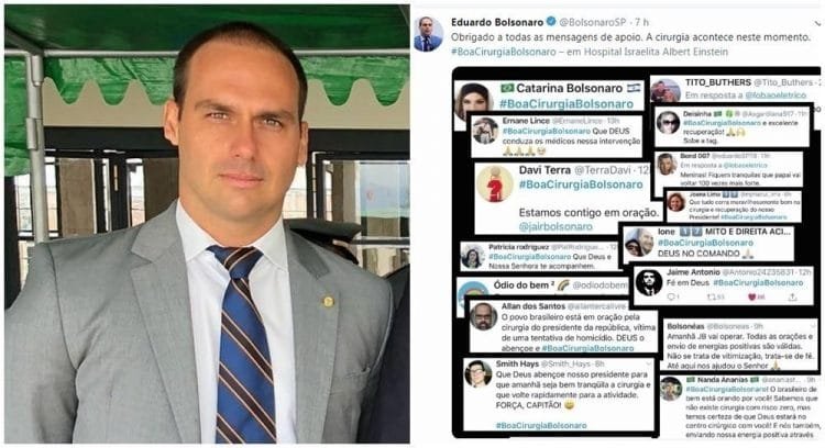 Já na manhã desta segunda-feira (28), o filho tweetou para informar a seus seguidores o momento da cirurgia. No post, ele agradeceu novamente e compartilhou um compilado de postagens de apoiadores que usaram a hashtag #BoaCirurgiaBolsonaro. A tag alcançou o topo dos Trending Topics e permaneceu por 5h entre os assuntos mais mencionados do Twitter. “Obrigado a todas as mensagens de apoio. A cirurgia acontece neste momento”, agradeceu Eduardo.