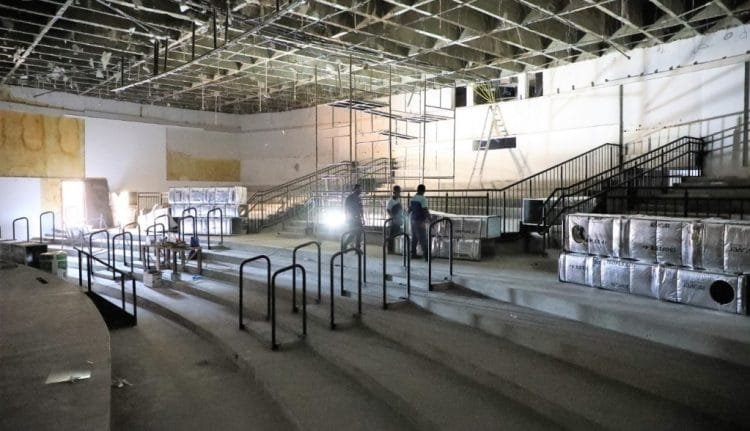 Hoje, quem passa pelo Centro Administrativo observa um movimento intenso, mas responsável, de trabalhadores empenhados na obra do Teatro Municipal. Toda parte estrutural, a parte grossa do serviço, como se costuma dizer, já foi concluída. Agora, as ações estão concentradas em duas frentes. Uma delas é responsável pela instalação do forro acústico de fibra mineral, do piso vinílico e dos carpetes. Também se dedica à conclusão da instalação elétrica e ao emassamento das paredes, preparação para a pintura, que será iniciada já na próxima semana.